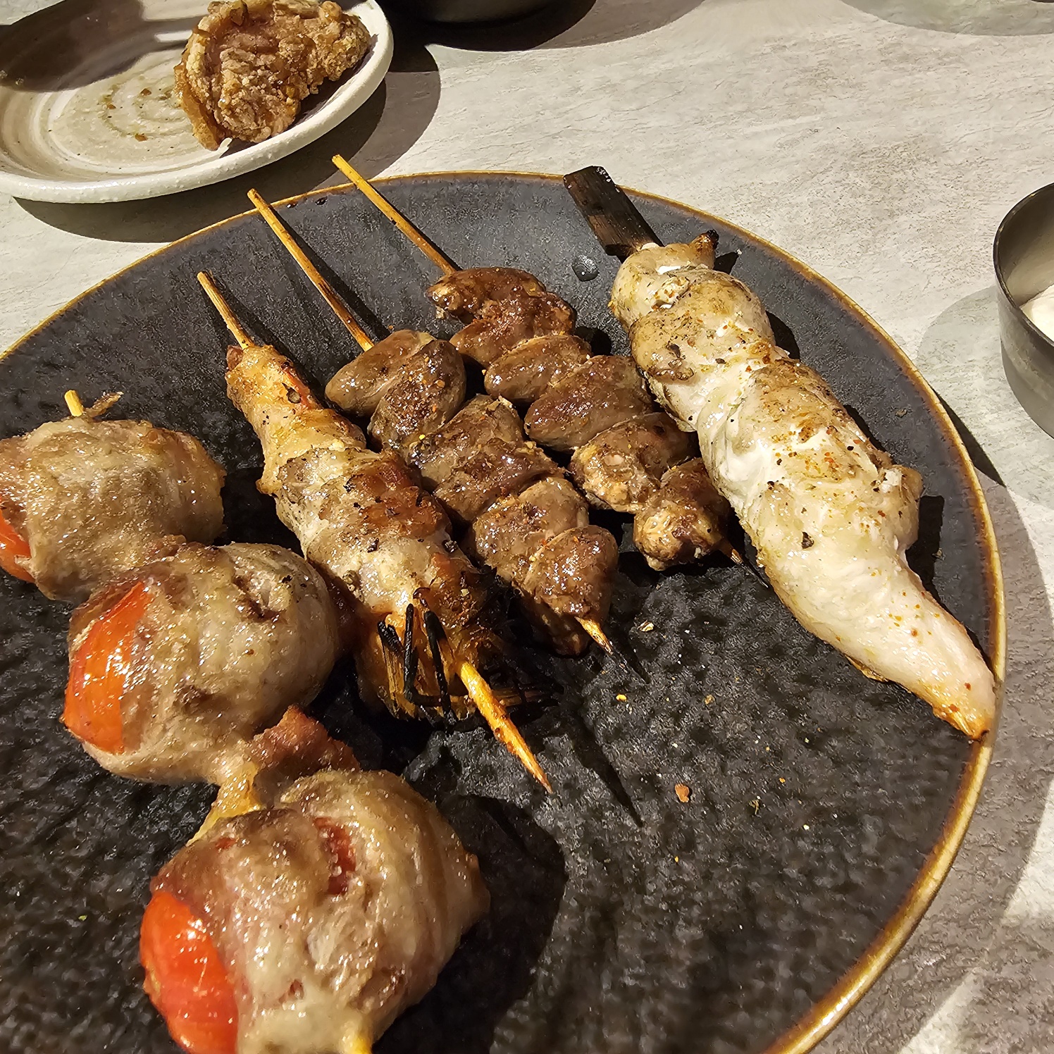 나머지 꼬치도 모두 부드럽고 맛이 있었지만, 토마토 삼겹말이는 과일의 신선한 맛과 삼겹살의 육즙이 한데 어우러져 전체적으로 균형 잡힌 식감이 느껴졌습니다.