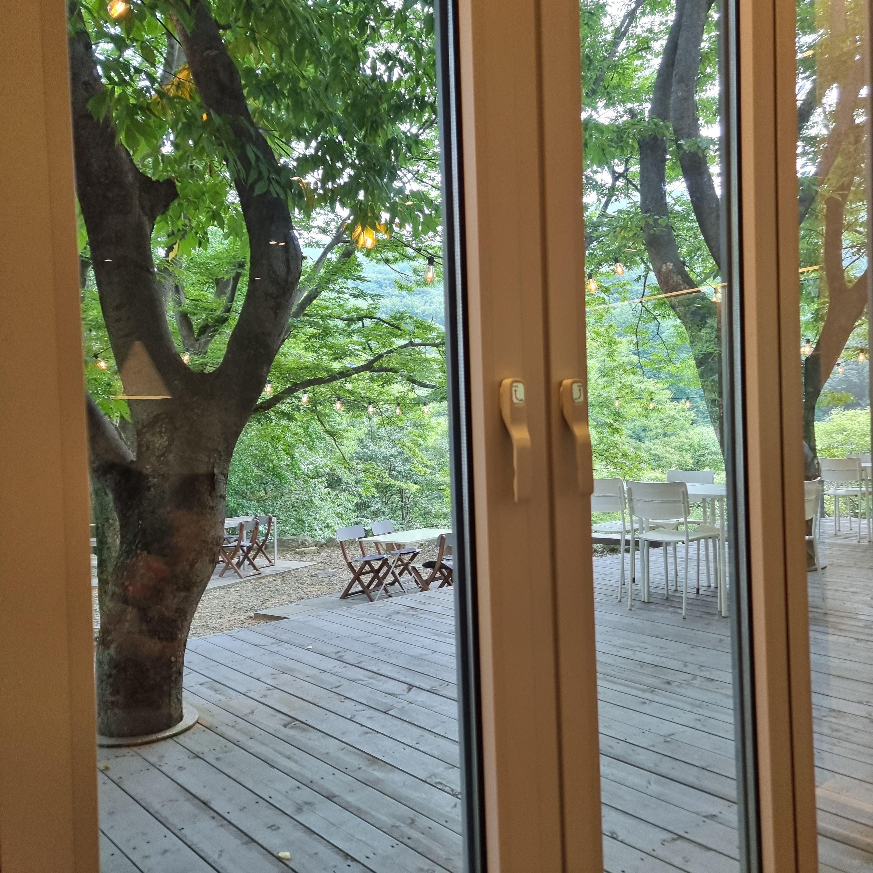 카페는 푸른 산들로 둘러싸여 있고, 문을 열고 나가면 그 아래로 아름다운 계곡이 펼쳐져 있습니다.