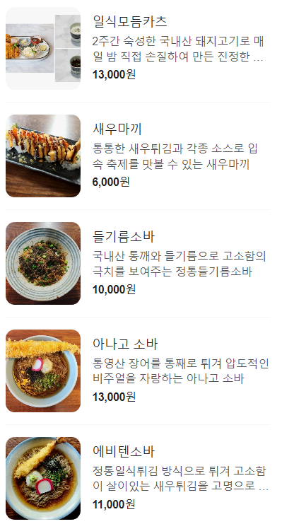 이 외에도 일식모듬카츠, 새우마끼, 들기름소바, 아나고 소바, 에비텐 소바 등 다양한 메뉴들이 많이 있어 좋아하시는 음식을 주문하시면 됩니다.