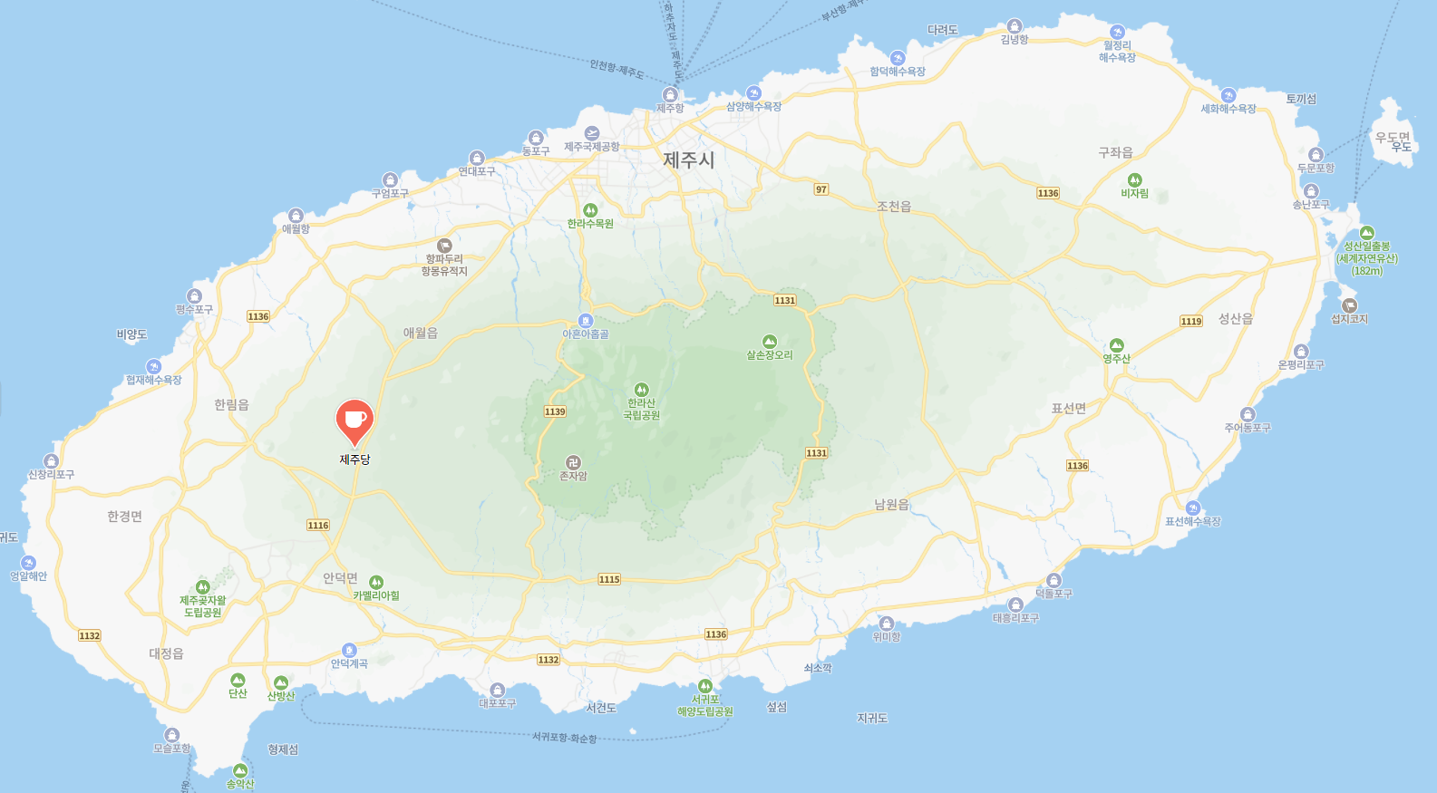 '제주당 카페'는 제주 제주시 애월읍 월각로 927에 위치하고 있으며, 중문관광단지에서 차로 18분 정도 걸리는 거리에 있습니다. (아르떼 키즈파크 도보 3분 거리에 위치)